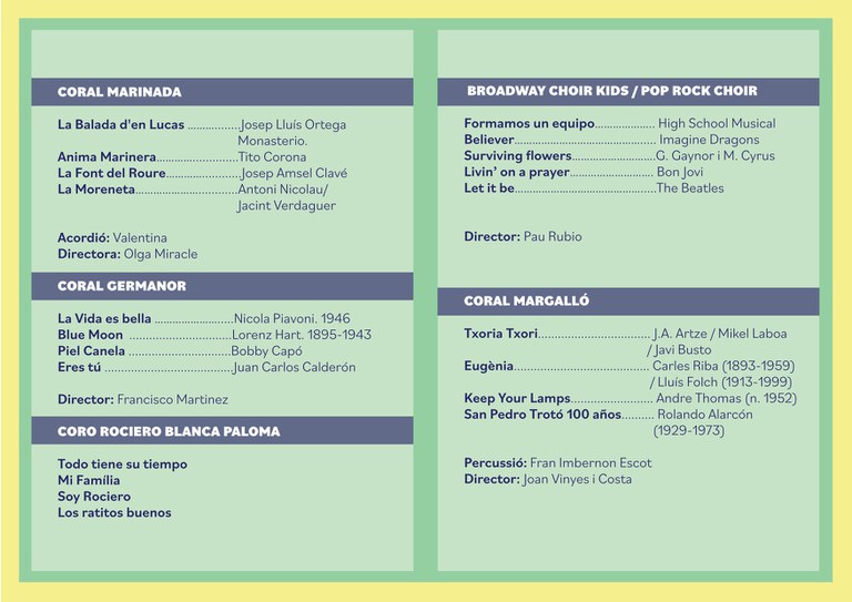 - Assistents Coral Marinada, Coral Germanor, Coro Rociero Blanca Paloma, Broadway Choir Kids / Pop Rock Choir i Coral Margalló Organitza: Coral Margalló amb el suport de la Regidoria de Cultura de l’Ajuntament de Castelldefels.