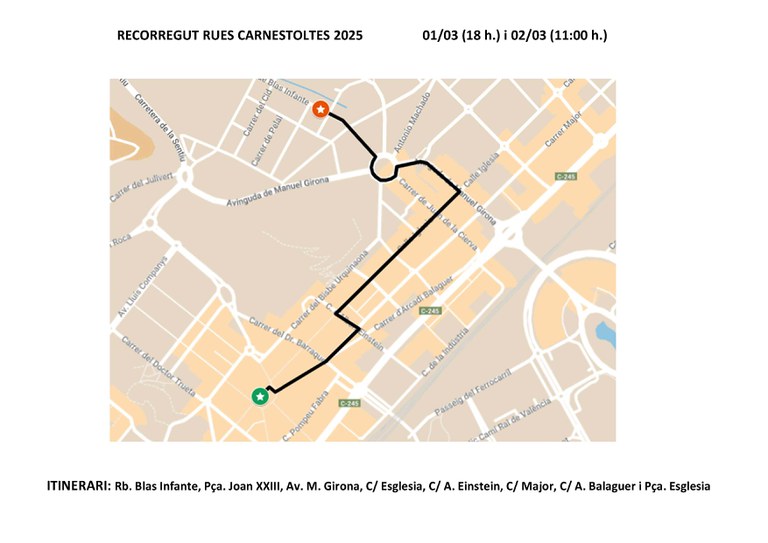 Amb motiu de les Rues adulta i infantil, el dissabte 1 de març, de 16 a 20 hores, i el diumenge 2 de març, de 10.30 a 12.30 hores, es tanca l'accés als guals dels edificis situats als carrers que recorren les comparses: avinguda Manel Girona, carrer Església, carrer Albert Einstein, carrer Major i carrer Arcadi Balaguer.