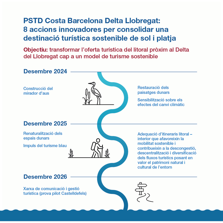 Les primeres actuacions que s’estan posant en marxa i que s’enllestiran a final d’any són la restauració de les dunes, la construcció d’un mirador dels flamencs al Prat de Llobregat, l’estudi de planificació de la mobilitat sostenible a la zona del Delta del Llobregat i l’estudi sobre l’impuls del turisme blau a la zona de la Costa Barcelona Delta Llobregat.
