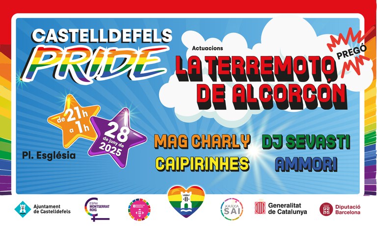 El 28 de juny, la Plaça de l’Església es convertirà en l’epicentre de la celebració de l’Orgull LGTBIQ+ 2025 a Castelldefels. La jornada començarà a les 21 h amb el pregó d’inici del Pride, a càrrec de la carismàtica i irreverent La Terremoto de Alcorcón, icona del col·lectiu i referent de la cultura queer.