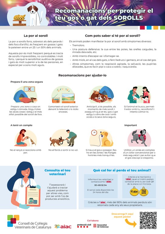 Amb l’objectiu d’ajudar els propietaris d’aquests animals de companyia, el Consell de Col·legis Veterinaris de Catalunya (CCVC), amb la col·laboració de Protecció Civil de la Generalitat de Catalunya, ha elaborat un pòster amb nou recomanacions, que poden consultar sota aquestes mateixes línies.