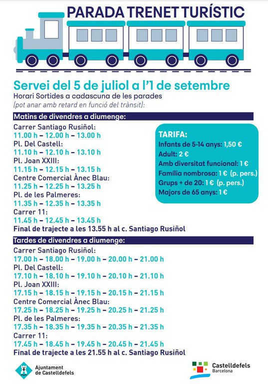 Enguany el trenet funcionarà de divendres a diumenge amb un horari de 11 a 13.55 h i de 17 a 21.55 h. El recorregut és circular, sortint del Centre (parada a c/Santiago Rusiñol) i té parades al Castell, a la plaça Joan XXIII, a L'Ànec Blau, a la Plaça de les Palmeres i al carrer 11 i torna al centre per l'Avinguda de la Pineda.