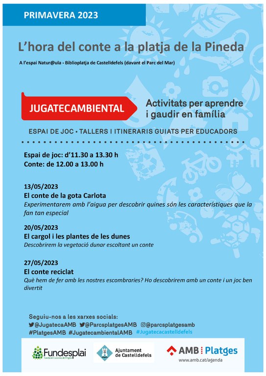 L’Espai Natur@ula - Biblioplatja, al passeig Marítim al davant del Parc del Mar, acull els dissabtes del mes de maig (del 13 al 27, de 12 a 13 hores) una nova activitat pensada per aprendre i gaudir en família. Es tracta d’una “Hora del conte a la platja”, que complementa la programació de la Jugatecambiental (que va començar el passat diumenge 7 de maig i que continuarà fins a l’11 de juny).