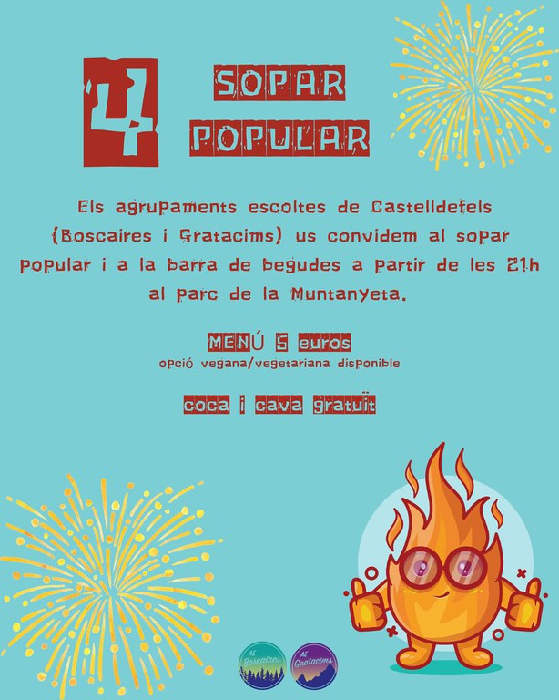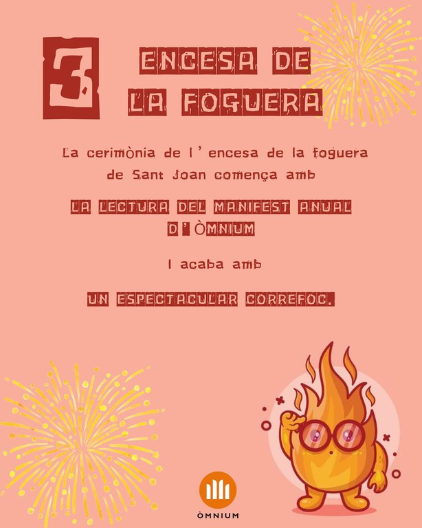 - 20.30 hores Encesa de la foguera, lectura del manifest, ball de diables i repartiment de coca i cava, al parc de la Muntanyeta