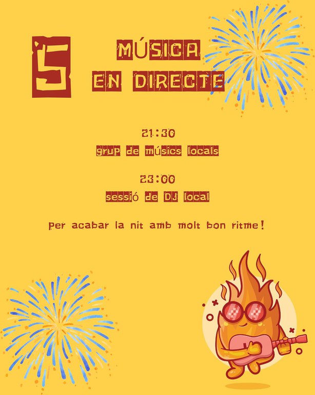 La celebració continuarà amb un concert del grup de músics locals a les 21.30 h i una sessió de DJ local a les 23 h.