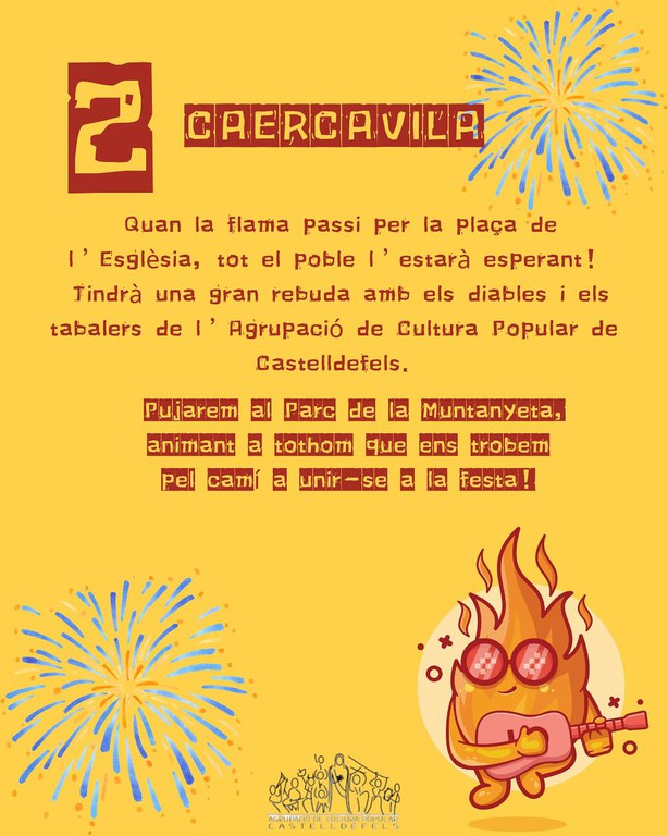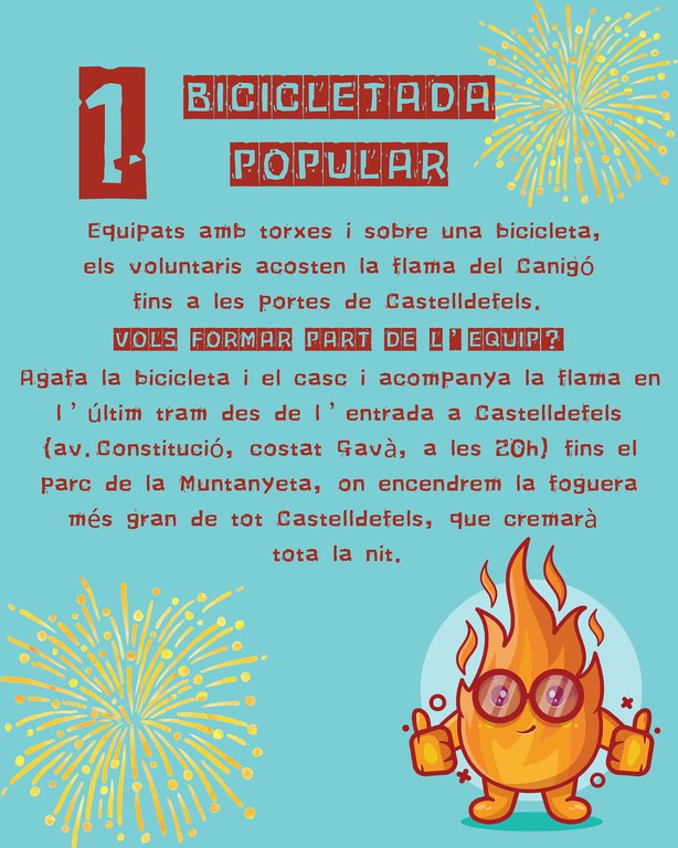 - 20 hores Arribada de la Flama a la plaça de l’Església i cercavila des de la plaça fins al parc de la Muntanyeta (Recorregut: Plaça de l’Església, c/ Pintor Serrasanta, rambla Josep Tarradellas i arribada al parc de la Muntanyeta)