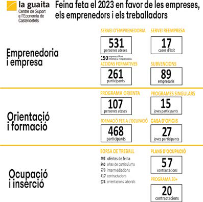 La Guaita, el Centre de Suport a l’Economia de Castelldefels, que el 2023 va celebrar 20 anys d’existència, va tancar l’any complint amb el seu objectiu d’ajudar al teixit econòmic de la ciutat i afavorir l’ocupació de les persones que hi viuen. Per aconseguir-ho aquest equipament municipal que reuneix els serveis de Promoció Econòmica va desplegar la seva acció en una doble direcció: l’atenció a les persones (amb programes de formació i orientació, on s’hi inclou la borsa de treball per exemple) i el suport a empreses i emprenedors. Els programes, serveis i activitats de dinamització econòmica estan dissseyats per oferir eines estratègiques i connectades a les demandes reals del mercat laboral.