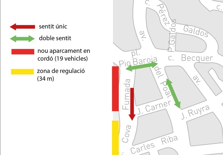 - Sentit únic del carrer de la Cova Fumada entre el carrer Carles Riba i la plaça Pío Baroja