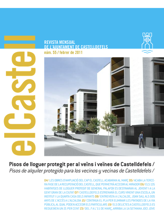 04/ LES OBRES D’AMPLIACIÓ DEL CAP EL CASTELL ACABARAN AL MARÇ 05/ ACABA LA TERCE - RA FASE DE LA RECUPERACIÓ DEL CASTELL, QUE PERMETRÀ ACCEDIR AL MIRADOR 06/ELS 135 HABITATGES DE LLOGUER PROTEGIT DE GENERAL PALAFOX ES DESTINARAN AL JOVENT I A LA GENT GRAN DE LA CIUTAT 07/ CASTELLDEFELS ESTRENARÀ EL CURS VINENT UNA ESCOLA, UN INSTITUT I LA QUARTA CASA DELS INFANTS 08/ ENTREVISTA A L’ALCALDE, JOAN SAU, ALS DOS ANYS DE L’ACCÉS A L’ALCALDIA 15/ CONTINUA EL PLA PER ELIMINAR LES PINTADES DE LA VIA PÚBLICA, AL QUAL PODEN ACCEDIR ELS PARTICULARS 19/ ELS DELICTES A CAS TELL DE FELS ES REDUEIXEN UN 21 PER CENT 23/ DEL 7 A L’11 DE MARÇ, ARRIBA LA 1A SETMANA JOCI JOVE