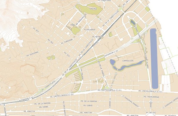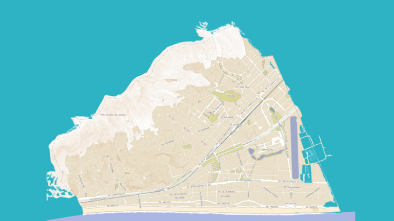 Mapa que mostra els carrers de la ciutat de Castelldefels, i part del seu relleu.