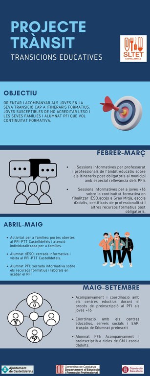 El SLTET porta a terme diferents projectes i accions en el procés de transició educativa amb l'objectiu d'ajudar a millorar la tria d'itineraris formatius a partir del segon cicle d'ESO i reduir l'abandonament escolar prematur. Aquests projectes compten amb el suport del Departament d'Educació i FP mitjançant el Pla Educatiu d'Entorn i el Servei d'orientació d'àmbit comunitari: