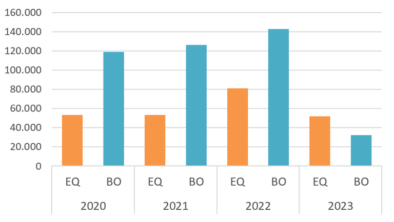 Si en el període 2017-2019 el consum d'aigua de l'ajuntament (via pública i equipaments municipals) representava aproximadament el 5% del consum total del municipi de Castelldefels, l'any 2023 aquest percentatge ha estat de tan sols l'1,86% del consum total de la ciutat. A continuació es presenta el seu repartiment entre el consum als equipaments (EQ) i el consum a la via pública (BO):
