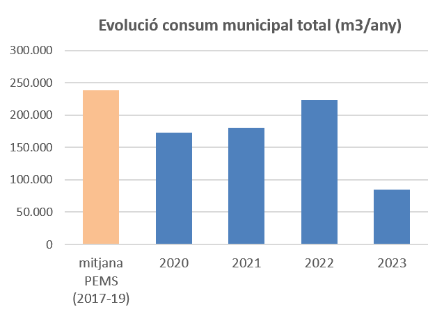 Pel que fa al seguiment del consum d'aigua de l'ajuntament (via pública i equipaments) dels darrers quatre anys, les dades mostren que hi ha hagut una reducció molt significativa respecte els anys que es van considerar per l'elaboració del PEMS (2017 a 2019). Especialment el 2023, quan van entrar en vigor les restriccions per sequera: