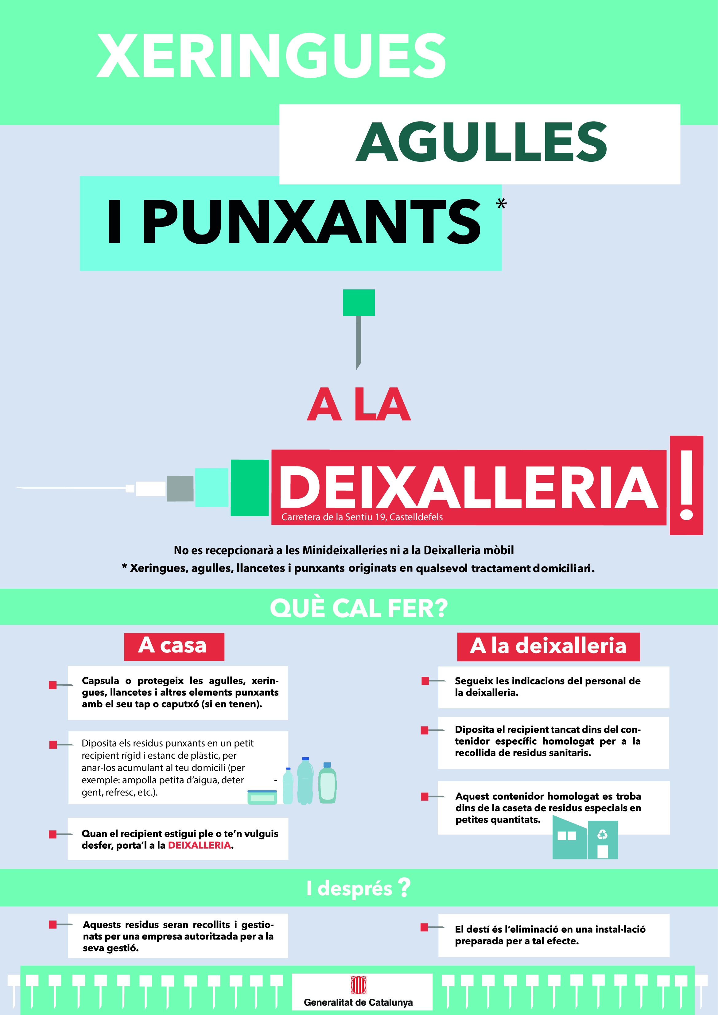 La recollida de xeringues, agulles i punxants d’ús domèstic es recolliran exclusivament a la Deixalleria municipal, situada a Carretera de la Sentiu 19. En cap cas es recolliran a les Minideixalleries ni a la Deixalleria mòbil. Click aquí