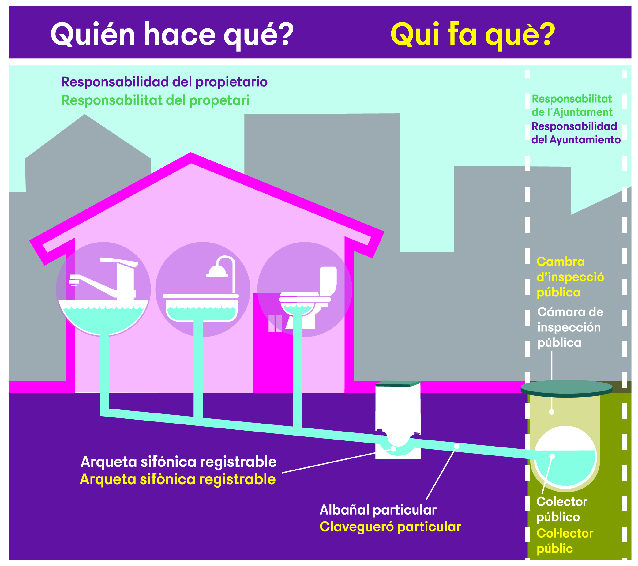 "És responsabilitat dels propietaris de les finques el manteniment i la conservació de les connexions de servei de la xarxa, que inclouen des del tram interior de la finca fins a l'arqueta sifònica, així com el tram que uneix aquesta arqueta amb la xarxa municipal de clavegueram (Article 57)".