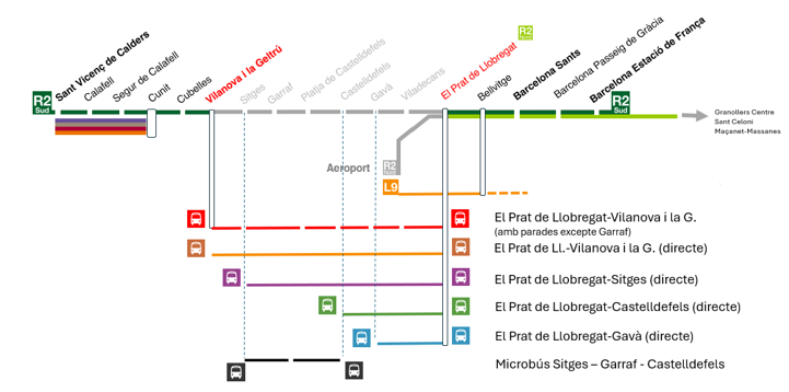 Del 1 al 4 de mayo se ven afectadas estaciones intermedias de líneas como la R2 Sur, incluidas Castelldefels centro y Castelldefels playa (Baixador) · Hay un plan alternativo de transportes por carretera: buses directos entre Castelldefels y El Prat de Llobregat (y viceversa) y un microbús entre Castelldefels y Garraf – Sitges