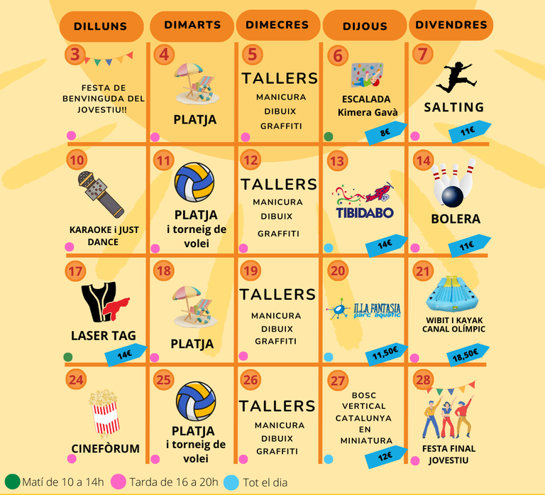 Las actividades incluyen una fiesta de bienvenida (3 de julio), excursiones (a la playa cada martes, al Tibidabo, Canal Olímpico, Salting, etc), Laser Tag, talleres (manicura, dibujo y graffiti, cada miércoles), sesiones de karaoke y “Just Dance” o la fiesta final del Jovestiu (el 28 de julio).