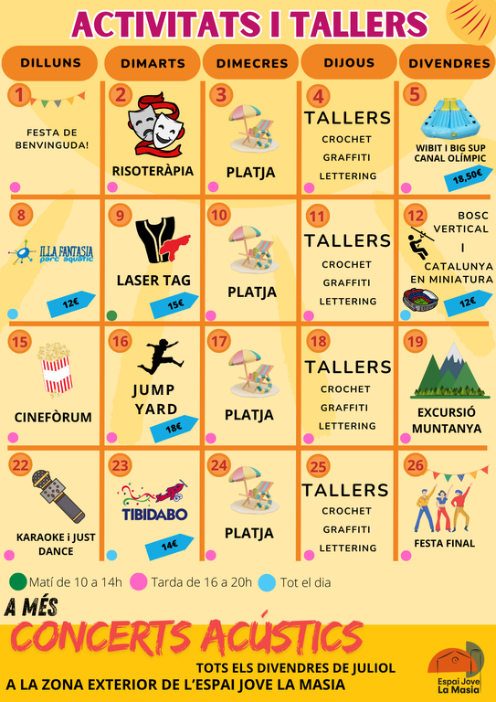 Las actividades incluyen una fiesta de bienvenida (1 de julio), excursiones (a la playa cada miércoles, al Tibidabo, Isla Fantasía, Catalunya en Miniatura, etc), Laser Tag, talleres (crochet, graffiti y lettering, cada jueves), sesiones de karaoke y “Just Dance”, o la fiesta final del Jovestiu (el 26 de julio). La principal novedad de este año es la celebración de Conciertos acústicos, todos los viernes de julio en la zona exterior del Espai Jove La Masia.
