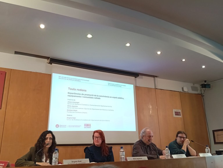 La técnica del Servicio de Mediación Ciudadana del Ayuntamiento Ángela Rubí moderó la mesa redonda "Experiencias de promoción de la convivencia en espacios públicos, equipamientos y comunidades vecinales" , donde participaban representantes de los ayuntamientos de Vic y Vilanova i la Geltrú.