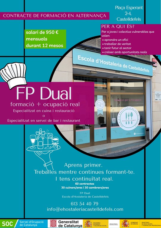 Castelldefels refuerza su apuesta por el empleo y la profesionalización del sector con el impulso de la FP Dual en Hostelería, un itinerario que combina formación práctica en la Escuela de Hostelería de Castelldefels e incorporación progresiva a empresas con contrato de formación en alternancia desde el primer día.