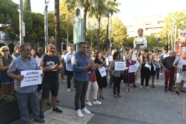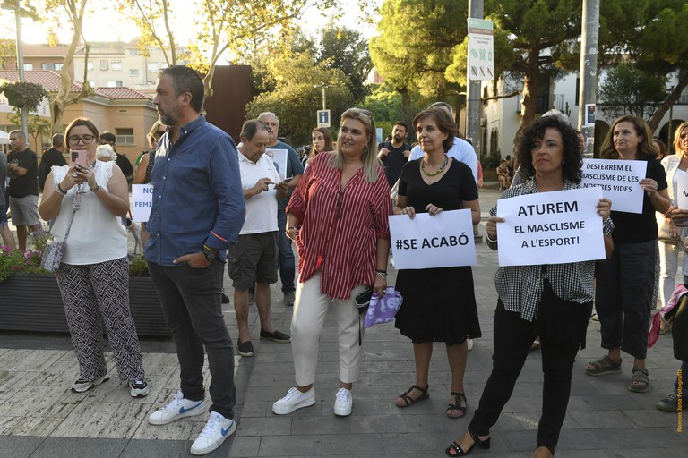 El acto, convocado por entidades y organizaciones sociales y políticas de la ciudad y con el apoyo del Ayuntamiento, tuvo lugar el pasado jueves 7 de septiembre en la Plaza de la Iglesia · Bajo el lema “Contra les violències masclistes. Ni a l'esport ni enlloc”, reunió a representantes de la sociedad civil de la ciudad, del consistorio (equipo de gobierno y oposición) y ciudadanía a título particular · Representantes de clubes deportivos de la ciudad leyeron comunicados de repulsa ante las violencias machistas en el deporte