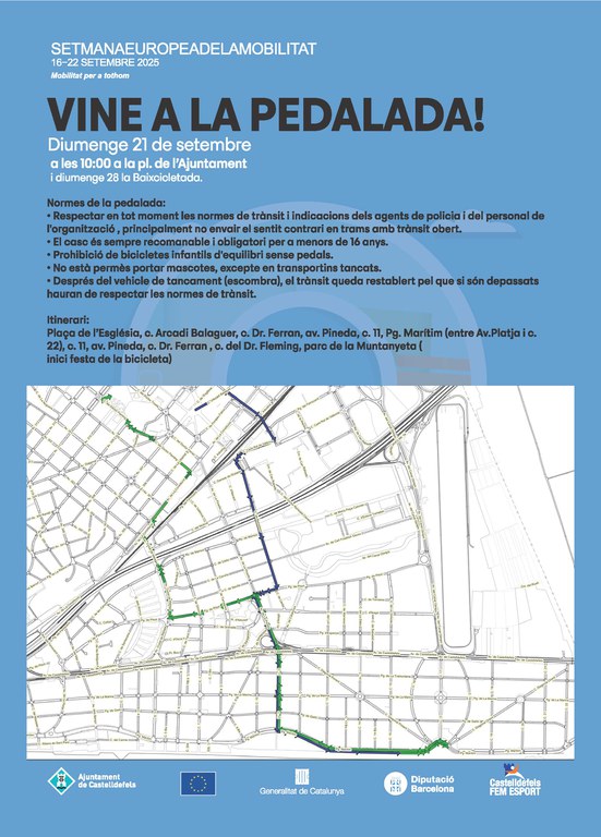 Por razones de seguridad, la pedalada modifica el recorrido previsto incialmente por el paseo Marítimo y se recorta (tendrá finalmente 7,4 kilómetros en total) · Castelldefels se suma a la Semana Europea de la Movilidad con una nueva edición de la Pedalada popular y la Fiesta de la Bicicleta • La pedalada saldrá a las 10 horas desde la Plaza de la Iglesia, mientras la Fiesta de la Bici se realizará a partir de las 11:30 horas en el parque de la Muntanyeta