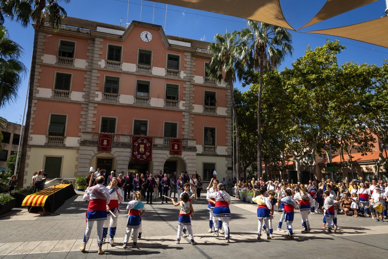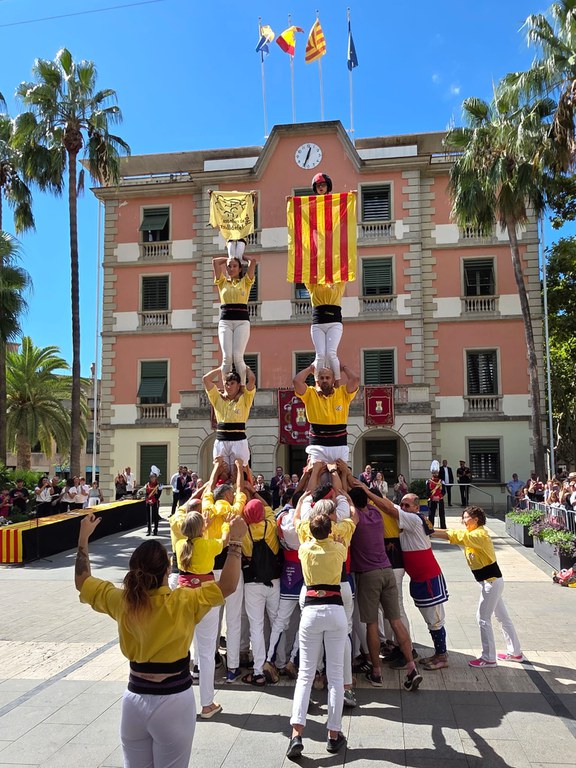 Ayuntamiento y entidades de la sociedad civil celebraron el 11 de septiembre una nueva Diada con actividades en la plaza de la Iglesia y Onze de Setembre · Contó con la ofrenda floral en el monumento de La Senyera, el discurso del alcalde Manu Reyes, una ballada de sardanas, el levantamiento de un pilar por parte de los Castellers de Castelldefels y una exhibición de Baile de bastones