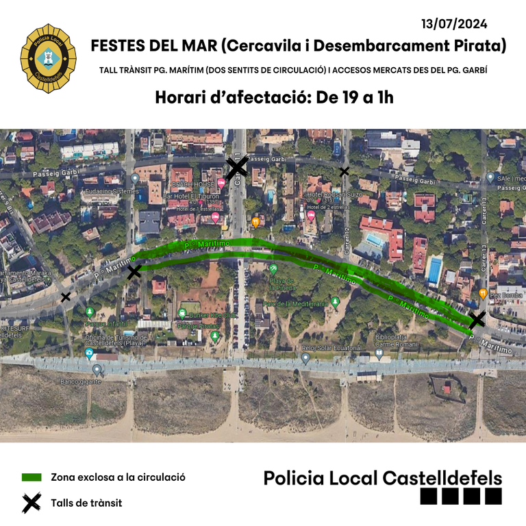 La tarde del sábado 13 de julio (19h) comienza con el pasacalle de piratas acompañados por los Tabalers de Castelldefels que recorrerán el paseo Marítimo desde la plaza de las Palmeras hasta la calle 11.