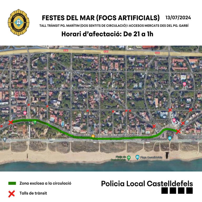 La tarde del sábado 15 de julio de 18.15 ha 2.15 h habrá servicio de autobús gratuito desde el centro a la playa ya la inversa. Paradas: c/ Santiago Rusiñol esquina c/ Pintor Serra y Santa yc/ 11 esquina paseo Marina.