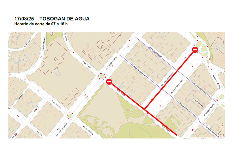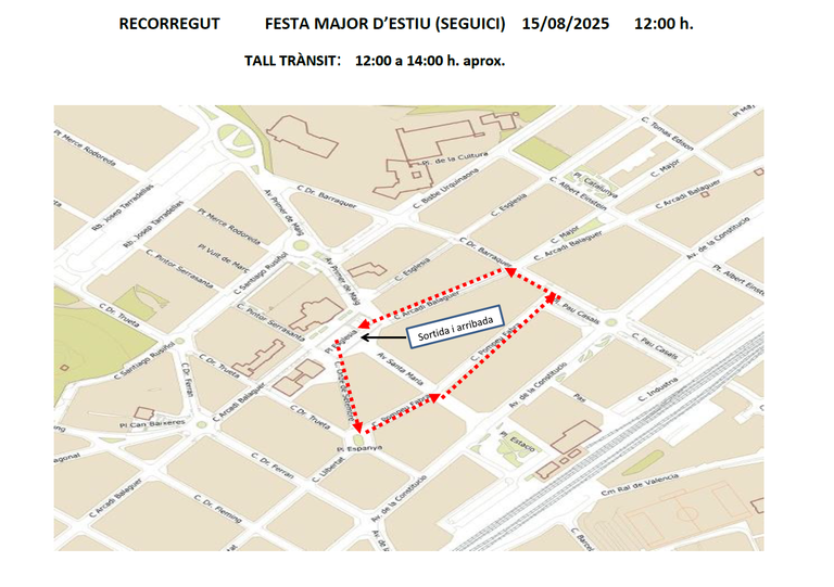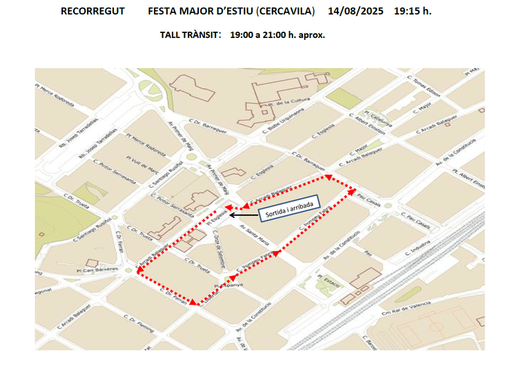 El Pasacalles (14 de agosto), el Cortejo (15 de agosto), el Correfoc (16 de agosto), el nuevo tobogán de agua (17 de agosto) y los Fuegos artificiales (17 de agosto) conllevan cortes que afectan a la circulación de vehículos en varias calles de la ciudad