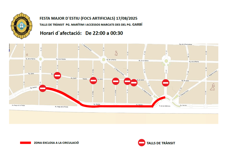 De 22 a 0:30 horas, aproximadamente. Se cortan, a la altura del paseo Garbí, las calles 12, 13 bis, 14 bis, 15, calle Diagonal Ponent y calle 17. Además, se crea una zona excluida a la circulación en el paseo Marítimo (entre calle 11 y calle 17).
