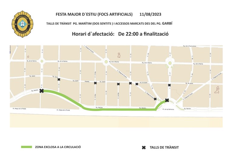 Fuegos artificiales – viernes 11 de agosto, a partir de las 22 horas. El paseo Marítimo se corta en ambos sentidos desde la calle 11 hasta la calle 17. Implica que también se corta la circulación en el paseo Garbí con las calles perpendiculares que desembocan en el paseo Marítimo (calle 12, calle 15, calle 17…)