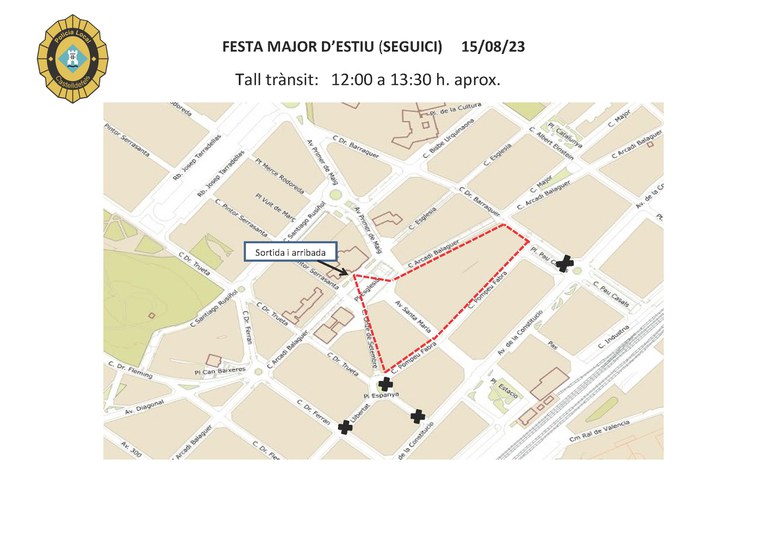 Correfoc – sábado 12 de agosto, entre las 20:30 y las 23 horas aproximadamente. Los cortes se hacen de forma progresiva, según avance el Correfoc y se cortan unas calles y se abren otras. Las calles afectadas por los cortes son Arcadi Balaguer con Doctor Ferran, Doctor Ferran con calle Libertad, avenida Constitución con Doctor Trueta, avenida Constitución con plaza Pau Casals, Bisbe Urquinaona con Albert Einstein y Bisbe Urquinaona con Primero de Mayo.