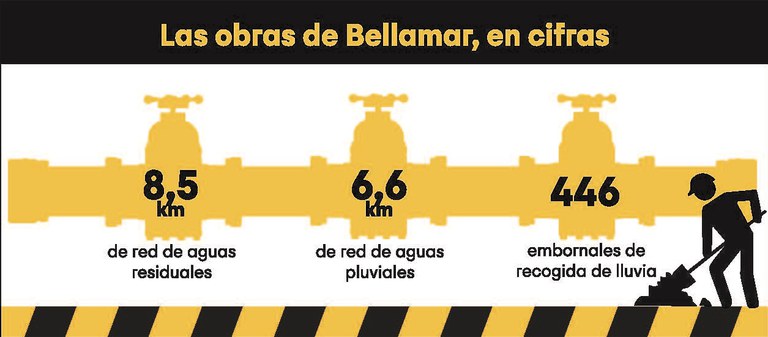 Recordamos que las obras en el barrio de Bellamar han comportado la instalación de 8,5 km de red de aguas residuales, de 6,6 km de red de aguas pluviales y 446 embornales de recogida de lluvia, tal y como pueden ver en el gráfico adjunto.