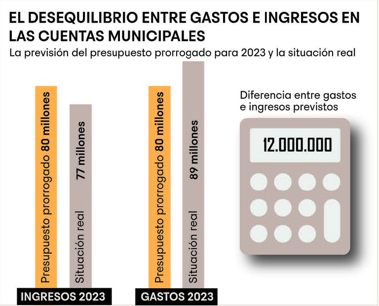 El desequilibrio entre gastos e ingresos en las cuentas municipales, comparando la previsión del presupuesto prorrogado para 2023 y la situación real, es el siguiente: los ingresos para 2023 eran de 80 millones (presupuesto prorrogado) pero finalmente serán de 77 millones de euros. En cuanto a los gastos, estaban previstos 80 millones de euros (presupuesto prorrogado) pero la situación real es que estos gastos suman 89 millones de euros. De esta manera, la diferencia entre gastos e ingresos previstos y la situación real es de 12 millones de euros. Más información en la infografía adjunta.