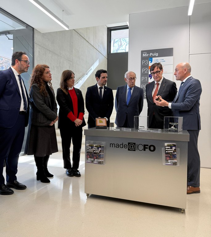Tras un recibimiento oficial en la entrada del ICFO, la comitiva realizó una breve visita al edificio principal del ICFO y se trasladó después al nuevo edificio (MPB), donde visitaron sus instalaciones y la sala de nano fabricación y la zona de exposición de muestras.