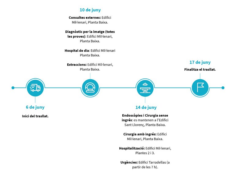El 14 de junio, se realizará el traslado al nuevo Hospital de Viladecans de todos los pacientes ingresados y el mismo día, desde las 7 horas, se iniciará el servicio de Urgencias en el edificio Tarradellas (en la avenida de Josep Tarradellas).