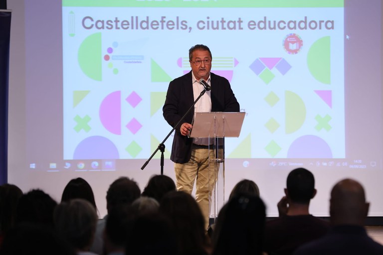 La Sala Margarita Xirgu de la Biblioteca Ramon Fernàndez Jurado acogió el pasado 4 de septiembre el acto, que sirvió también para presentar al nuevo profesorado y despedir a las profesoras y profesores que se jubilan · Las clases comienzan este miércoles 6 de septiembre, con Infantil y Primaria en horario de mañana y tarde (novedad de este año) · Se mantiene la ratio de 20 alumnos en I3 y I4 por grupo en los centros de titularidad pública, la continuidad de los 22 grupos de I3 en Castelldefels y la ampliación de la oferta de formación profesional con un nuevo ciclo de grado medio