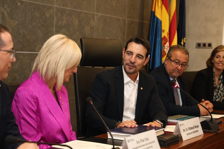 Pilar Díaz Romero ha sido recibida institucionalmente esta mañana por una delegación municipal encabezada por el alcalde Manu Reyes y el primer teniente de alcalde, Nico Cerpa, y representantes de todos los grupos políticos del consistorio · La gestión del Canal Olímpico y el proyecto de ampliación del aeropuerto de El Prat han sido dos de los principales temas tratados en el encuentro