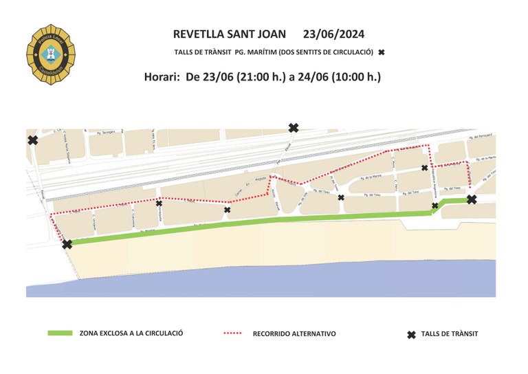 El tráfico estará cortado en el Paseo Marítimo (entre avenida República Argentina y el puente del Poal) entre las 21 horas del domingo 23 de junio y las 10 horas (aproximadamente) del lunes 24 de junio. El cierre también afecta al tráfico en los dos puentes de la avenida Eucaliptus y Cova Fumada.
