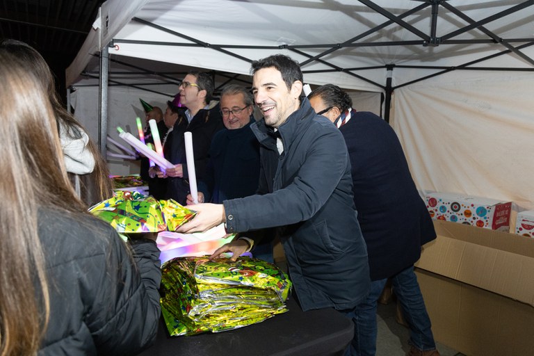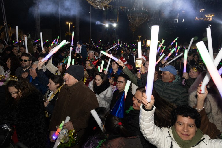 Las miles de personas que acudieron a la plaza pudieron disfrutar de las Campanadas en directo a través de una pantalla gigante y recibieron una bolsa de cotillón y un bastón de luz LED para dar la bienvenida al nuevo año.