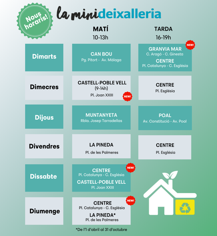 Domingo por la mañana:abrirá el Minipunto limpio del Centro(plaza de la Iglesia) de 10 a 13 horas. A partir del 1 de abril hasta el 31 de octubre,también abrirá de 10 a 13 horas el Minipunto limpio de La Pineda(Plaza de las Palmeras).