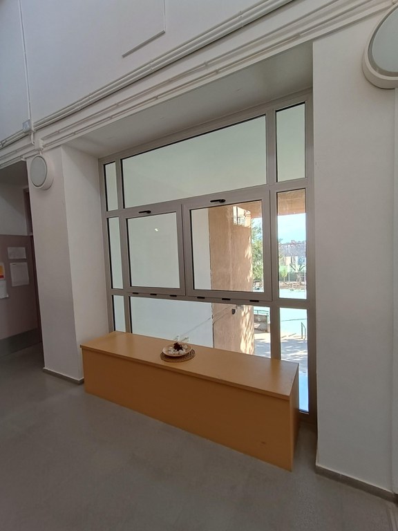 Sustitución de las carpinterías de los accesos principales del centro . Se han retirado los cierres existentes, que eran de hierro, con reja y cristales simples y se ha sustituido por carpinterías de aluminio con cristal de cámara. La actuación mejora el aislamiento térmico, la entrada de luz natural y la funcionalidad del centro.