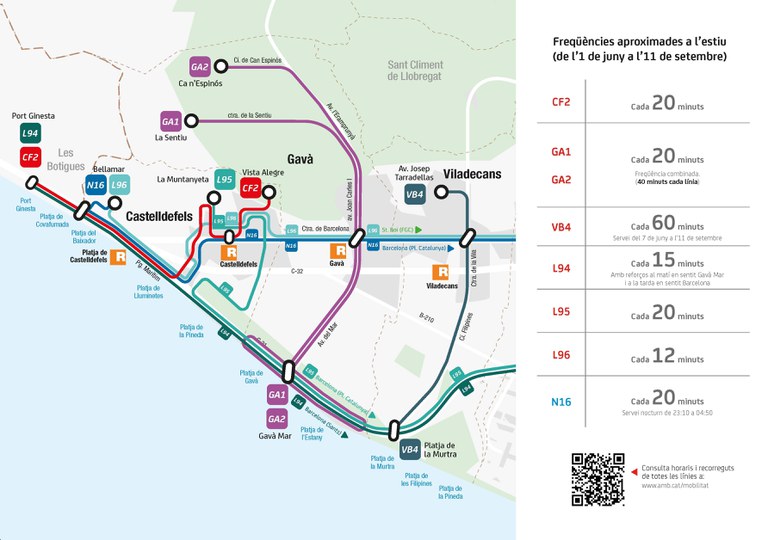 Hasta el 11 de septiembre, las líneas L94, L95 y L96 mejoran su frecuencia los fines de semana y festivos · Además, la L94 aumenta sus expediciones y la línea nocturna N16 da servicio cada 20 minutos (23.10 horas a 04.50 horas, entre Castelldefels y Barcelona)