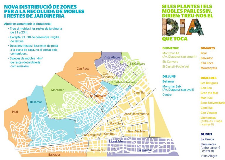 - Es necesario depositar muebles/trastos viejos o restos de jardinería el día que toca. Puede realizar la consulta en el buscador que encontrará en la web barrinet.castelldefels.org ( ENLACE)