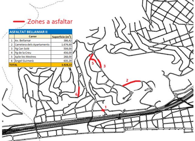 Los días 12 y 13 de septiembre, jueves y viernes de esta semana, se ejecutan los trabajos de renovación del pavimento asfáltico de casi 4.000 m2 de calles del barrio de Bellamar. Las tareas son las previstas dentro del "Segundo contrato basado en el acuerdo marco de obras de asfaltado con destino a los entes locales de Catalunya".