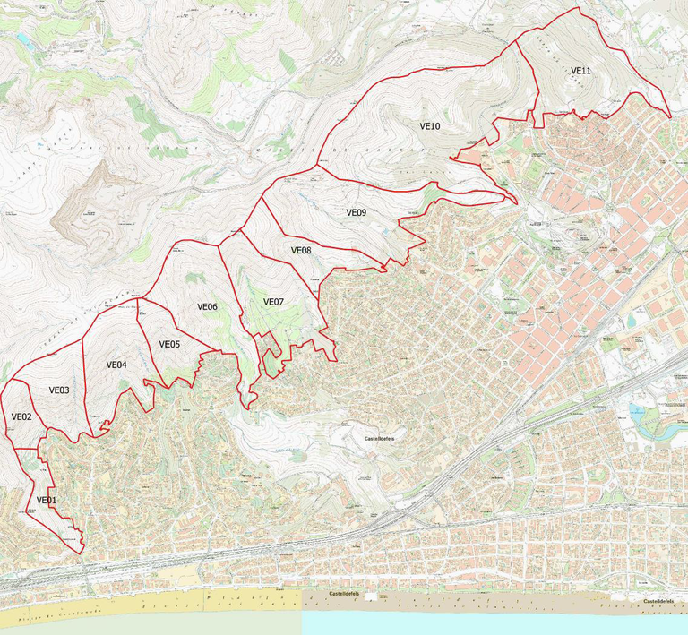 En cuanto a los taludes urbanos que presentan cierta entidad dentro del municipio de Castelldefels, se han localizado un total de 22 en diversos puntos del municipio. La mayor parte están situados en el extremo suroeste del municipio (ver plano adjunto). También se hace el seguimiento de las vertientes del municipio, 11 en total (ver plano adjunto).