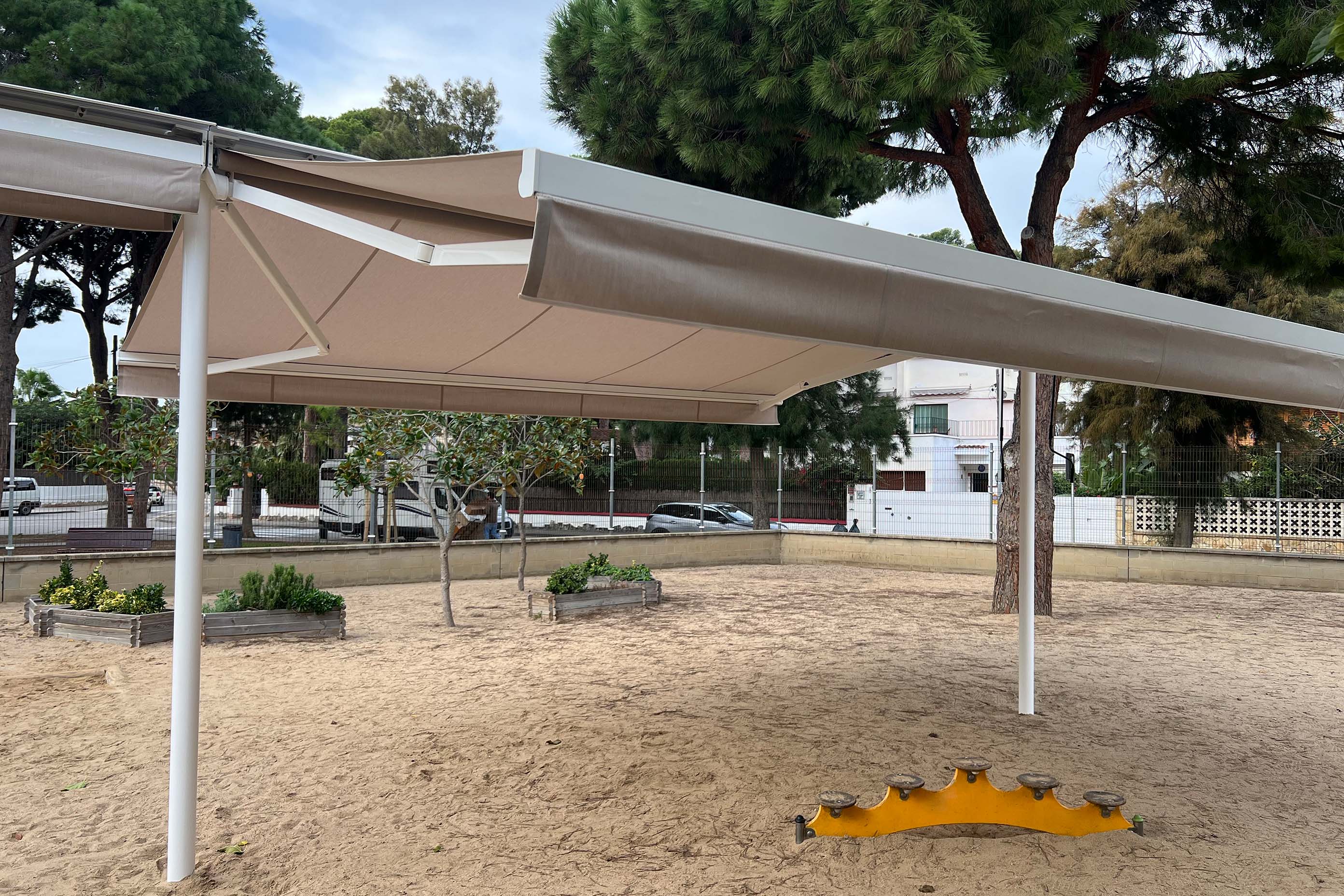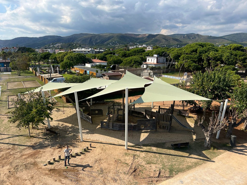 Seguimos mejorando nuestros espacios públicos: se instalan pérgolas en las áreas de juego para dar sombra y crear refugios climáticos. ¡Más confort, más juego, más comunidad!