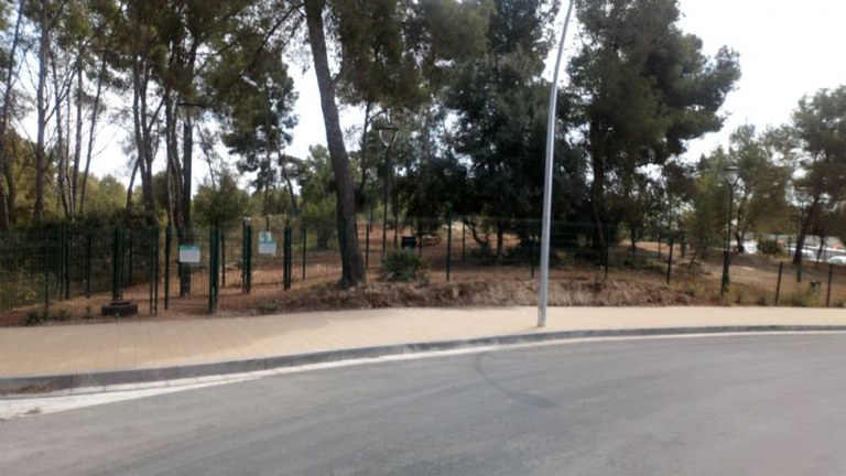 Vallat perimetral, papereres, bancs i llum. Espai específic per a cadells i gossos petits. Superfície: 640 m2 (espai gossos grans), 425 m2 (espai gossos petits). Total 1.065 m2.