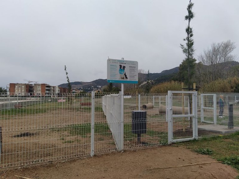 Vallado perimetral, papeleras y bancos. Espacio específico para cachorros y perros pequeños. Superficie: 515 m2 (espacio perros grandes), 247 m2 (espacio perros pequeños). Total 762 m2. Se han plantado árboles de hoja caduca (moreras), que darán sombra en verano.